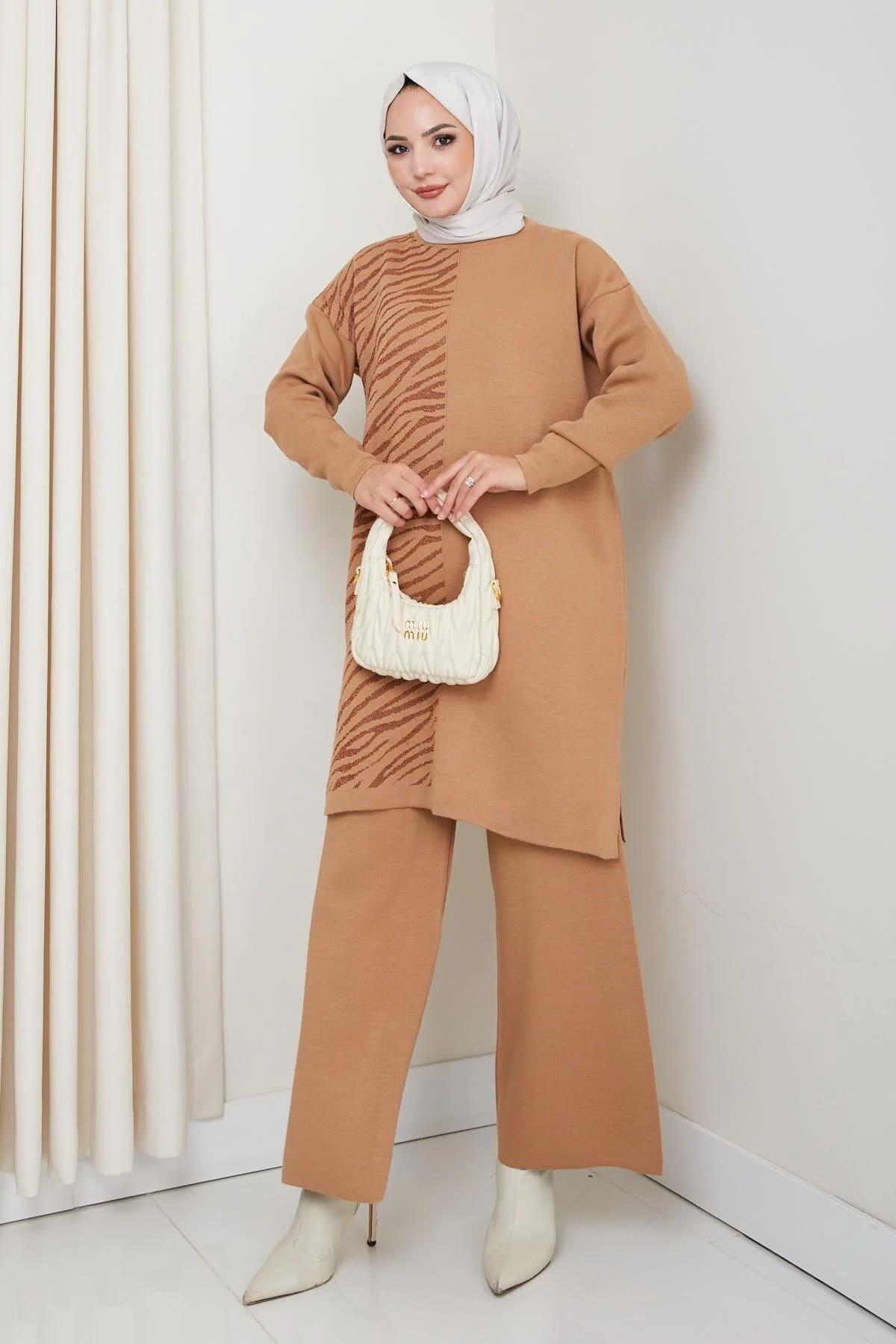 Kadın Bej Zebra Desenli Triko Tunik – Uzun Kol Rahat Kalıp