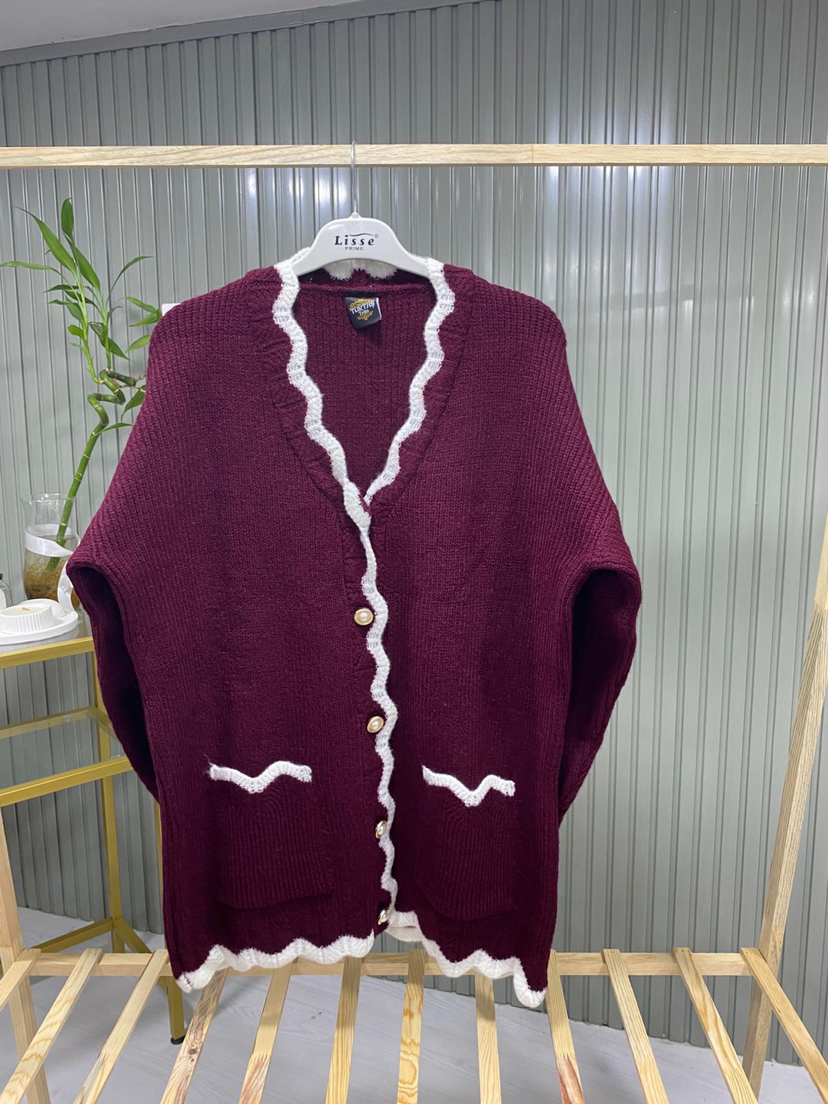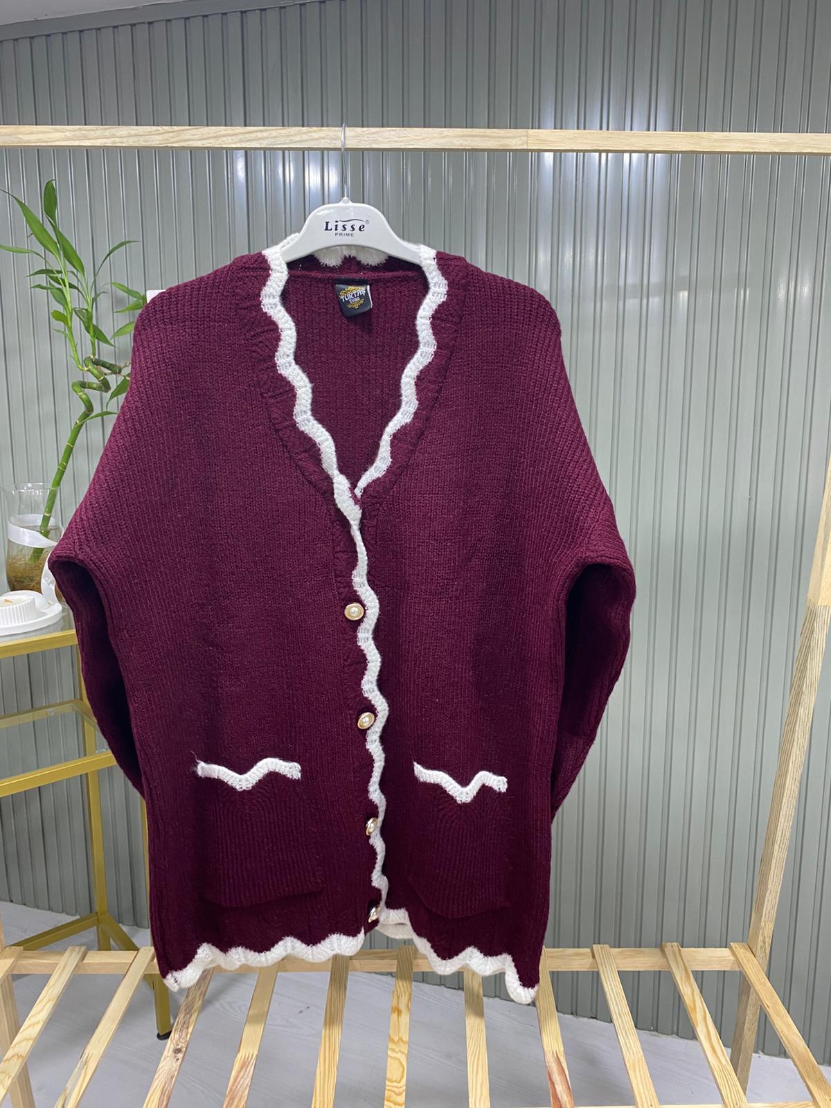 Kadın Bordo V Yaka Dalgalı Kenarlı Salaş Triko Hırka
