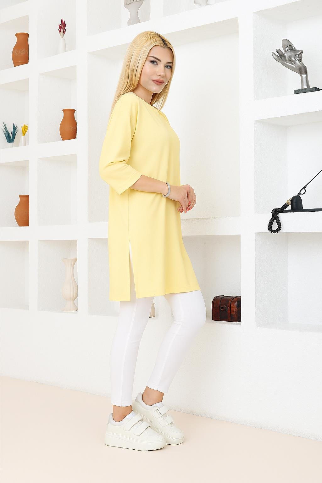 Kadın Limon Sarısı Oversize Tunik Tişört – Yarım Kollu, Yuvarlak Yaka, Rahat Kesim