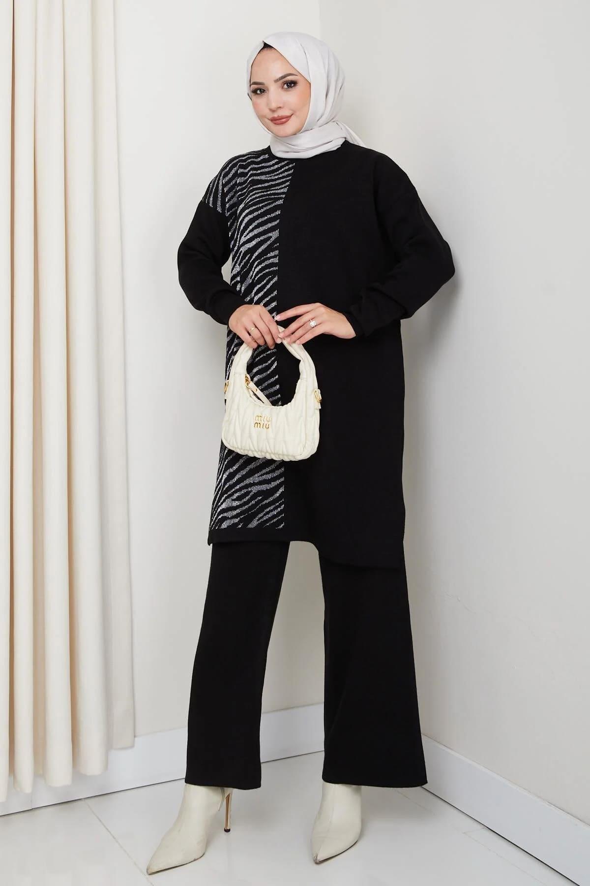 Kadın Siyah Zebra Desenli Triko Tunik – Uzun Kol Rahat Kalıp