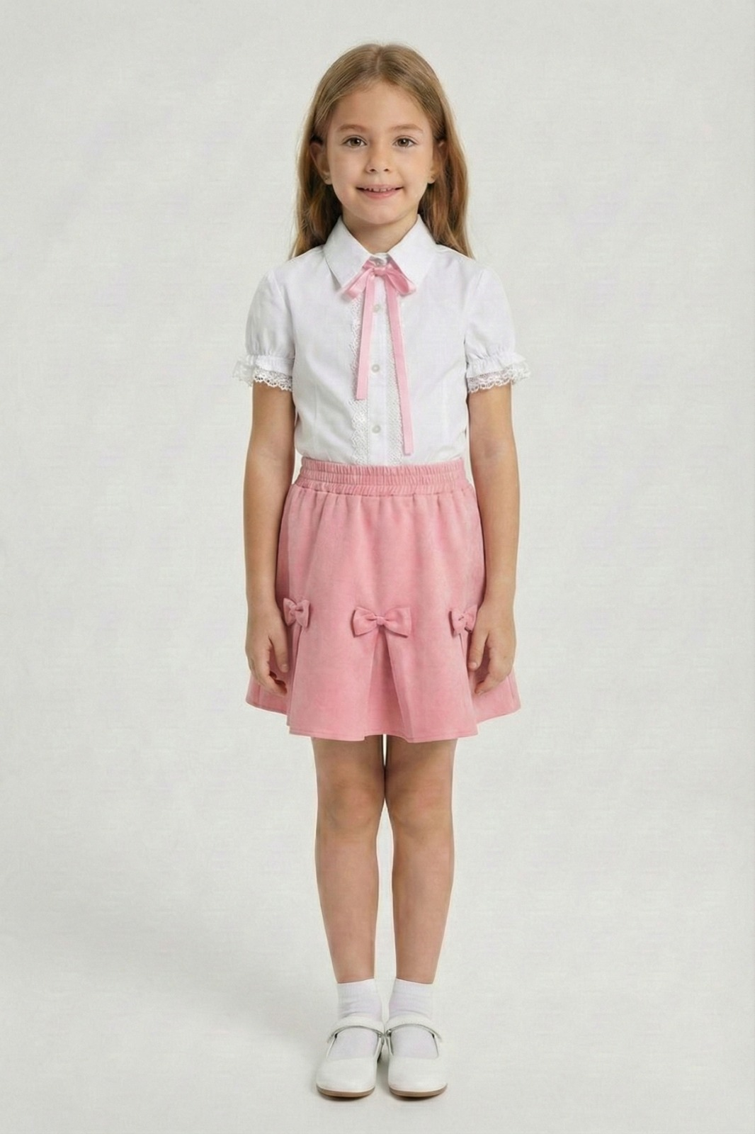 Kız Çocuk Pembe Fiyonklu Dantel İşlemeli Gömlek Pembe Kurdeleli Etek Takım 23 Nisan 29 Ekim
