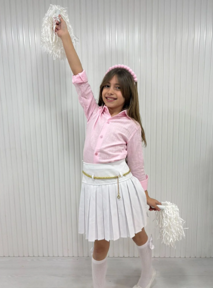 Kız Çocuk Pembe Gömlek & BeyazPileli Etek Takım – Özel Gün / Okul 23 Nisan