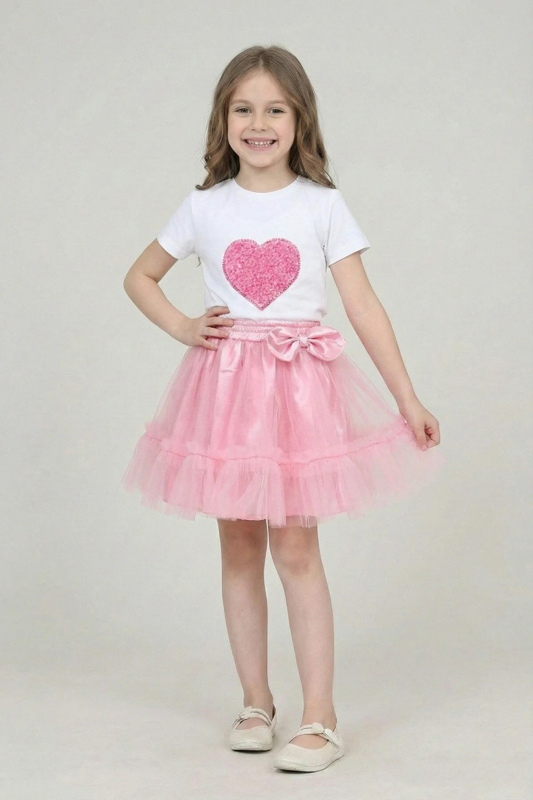 -Ürün normal kalıptır.; Günlük giyilen yaş tercih edilebilir - Kız çocukları için özel olarak tasarlanmış, şık ve eğlenceli bir görünüm sunar.; - Pembe kalp tişört ve pembe fırfırlı tütü etek kombinasyonu ile dikkat çekici bir stil oluşturur.; - 23 Nisan gösterileri ve özel günlerde giyilebilecek ideal bir kıyafet seçeneğidir.; - Çocuğunuzun rahat hareket etmesini sağlayan esnek ve konforlu materyalden üretilmiştir.; - Canlı renkleri ve sevimli kalp deseniyle çocukların beğenisini kazanır.;