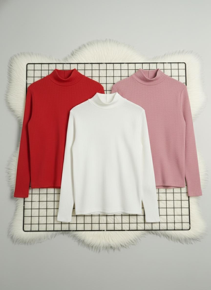 Kız ve Erkek Çocuk 3'lü Paket Kırmızı Beyaz Pembe Fitilli Yarım Balıkçı Yaka Uzun Kollu Body İçlik