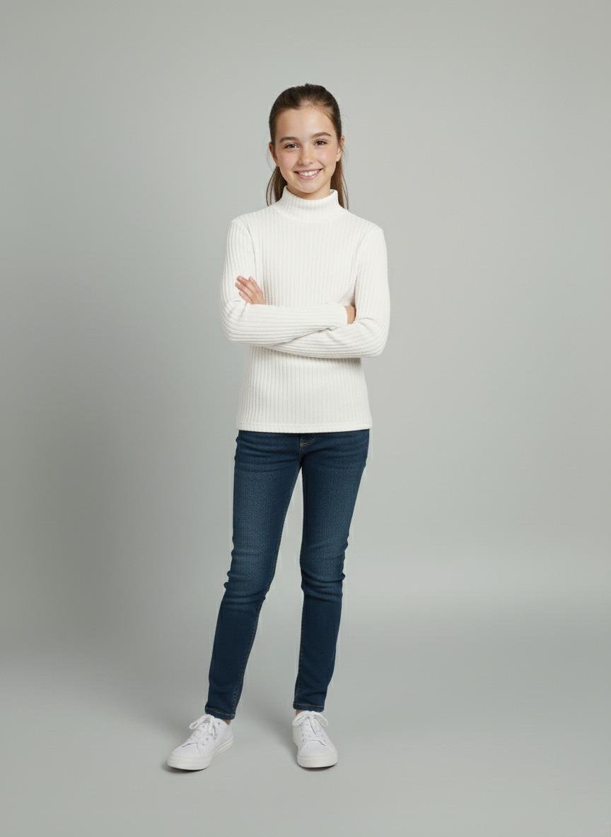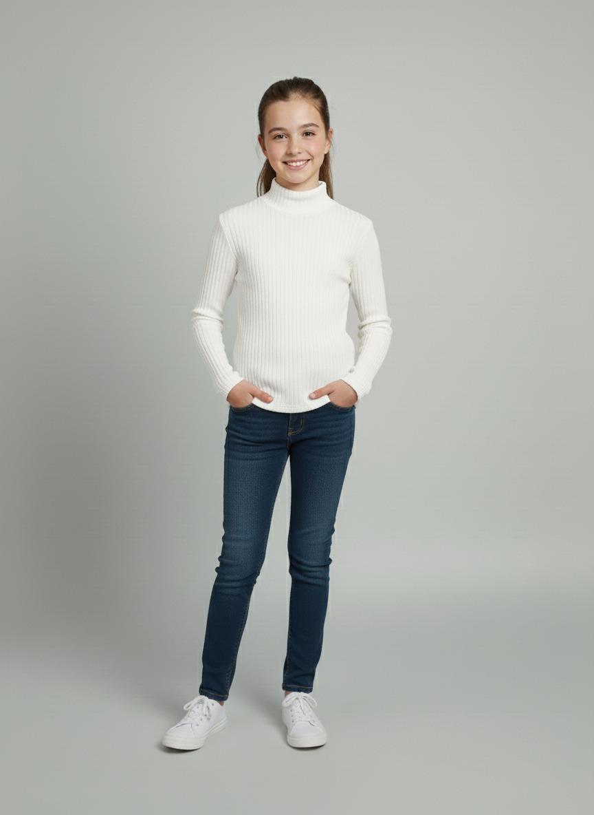 Kız ve Erkek Çocuk Beyaz Fitilli Yarım Balıkçı Yaka Uzun Kollu Body İçlik