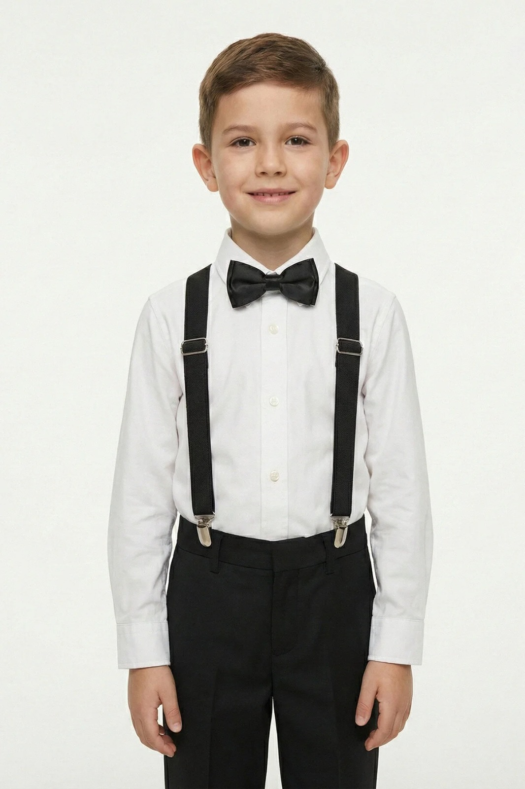 Erkek Çocuk Beyaz Uzun Kol Gömlek Siyah Askı Papyon Set 23 Nisan 29 Ekim Gösteri Kıyafeti