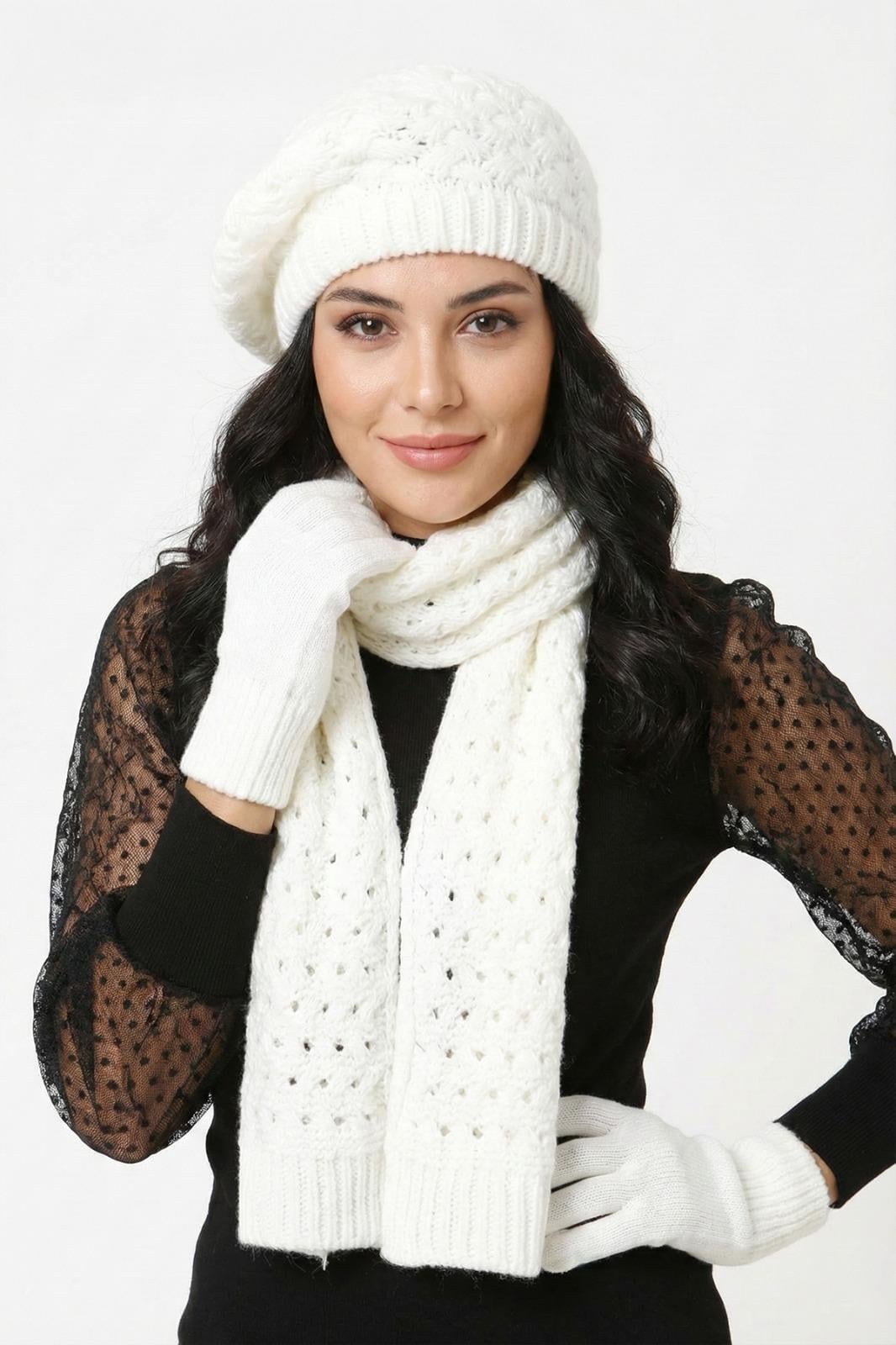 - Yumuşak triko kumaştan üretilmiş, kış aylarında sıcak tutan bir bere, atkı ve eldiven setidir.
