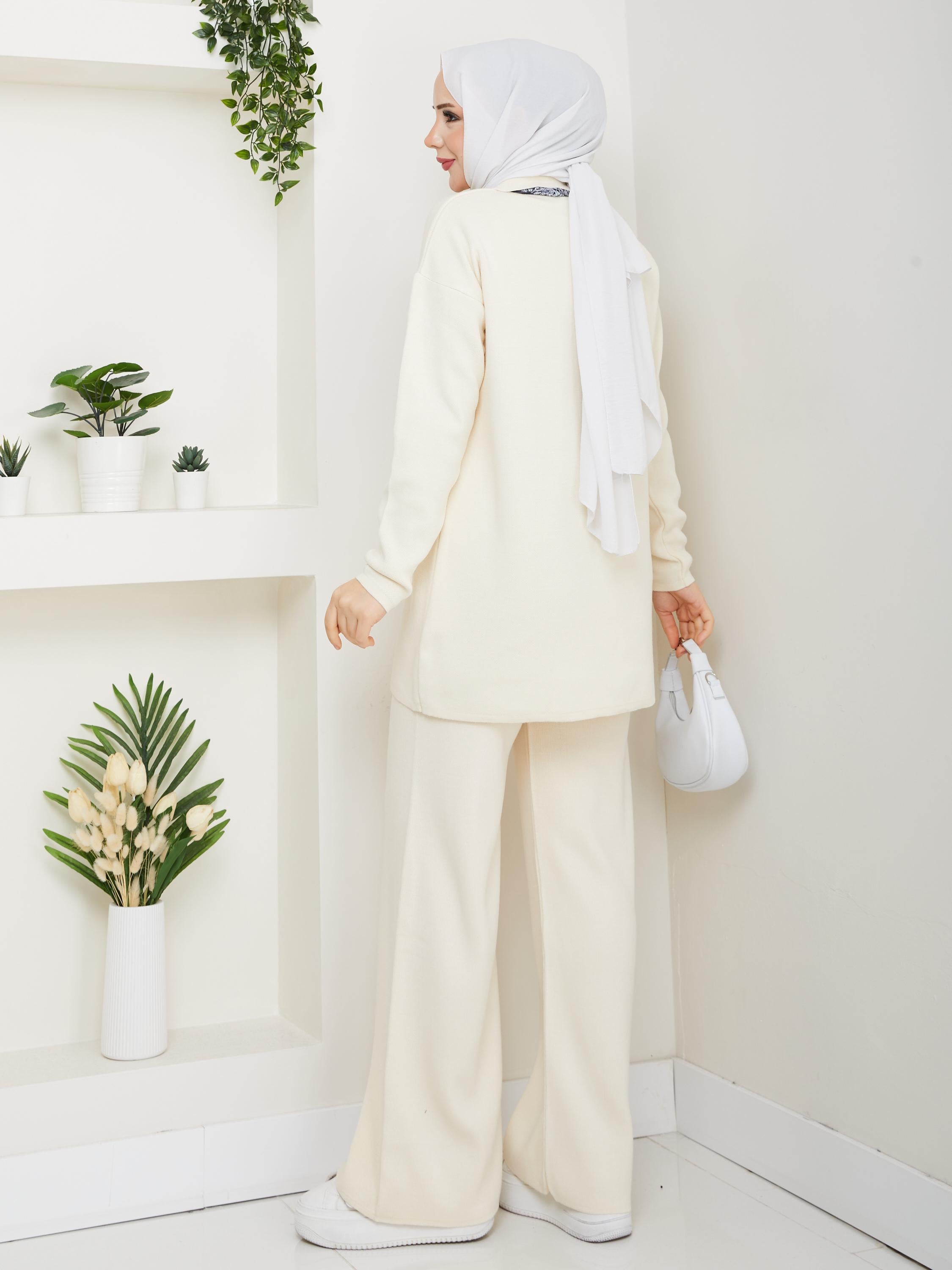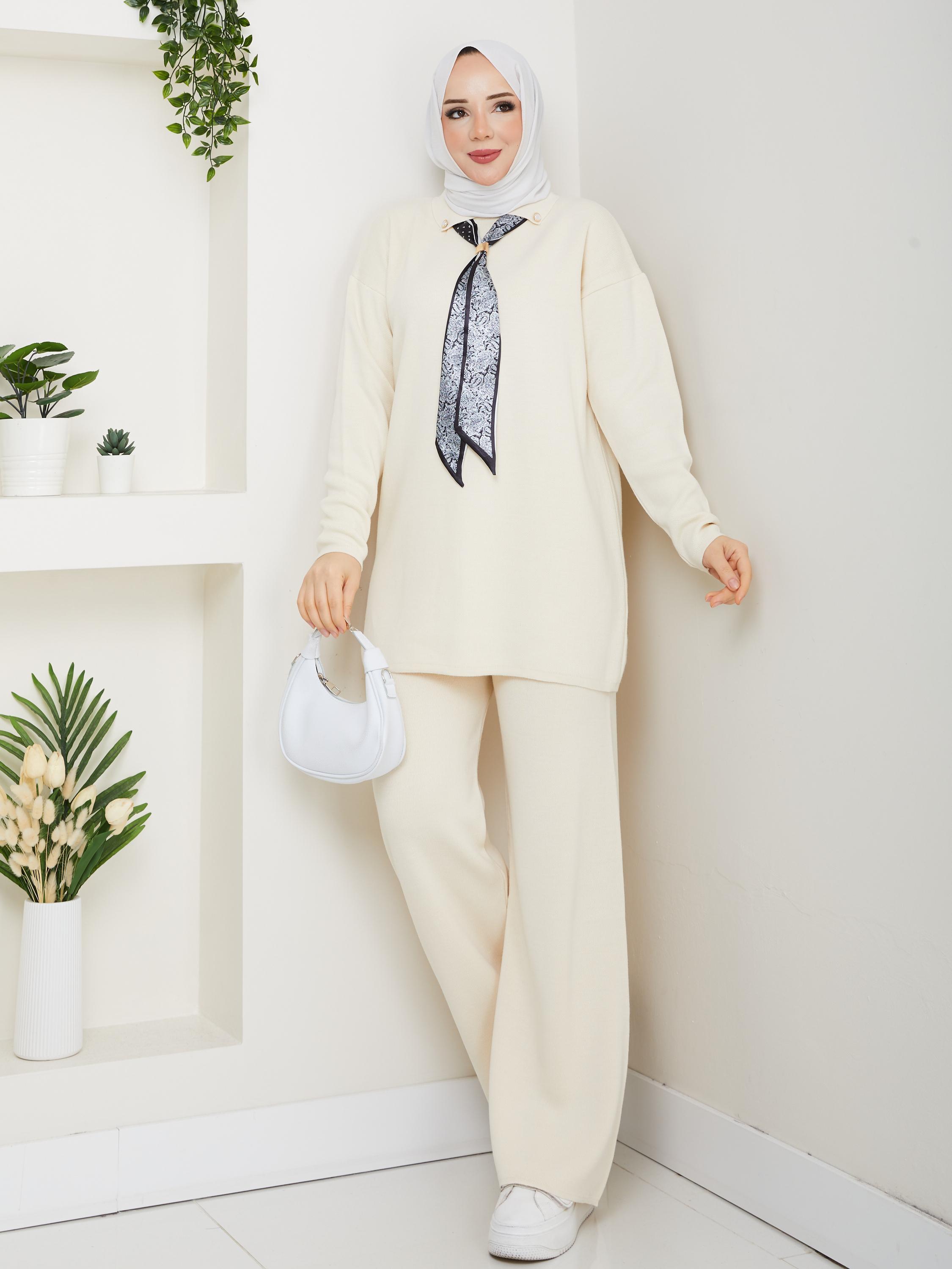 Kadın Krem Fular Detaylı İkili Tesettür Triko Takım - Tunik Pantolon Kombini