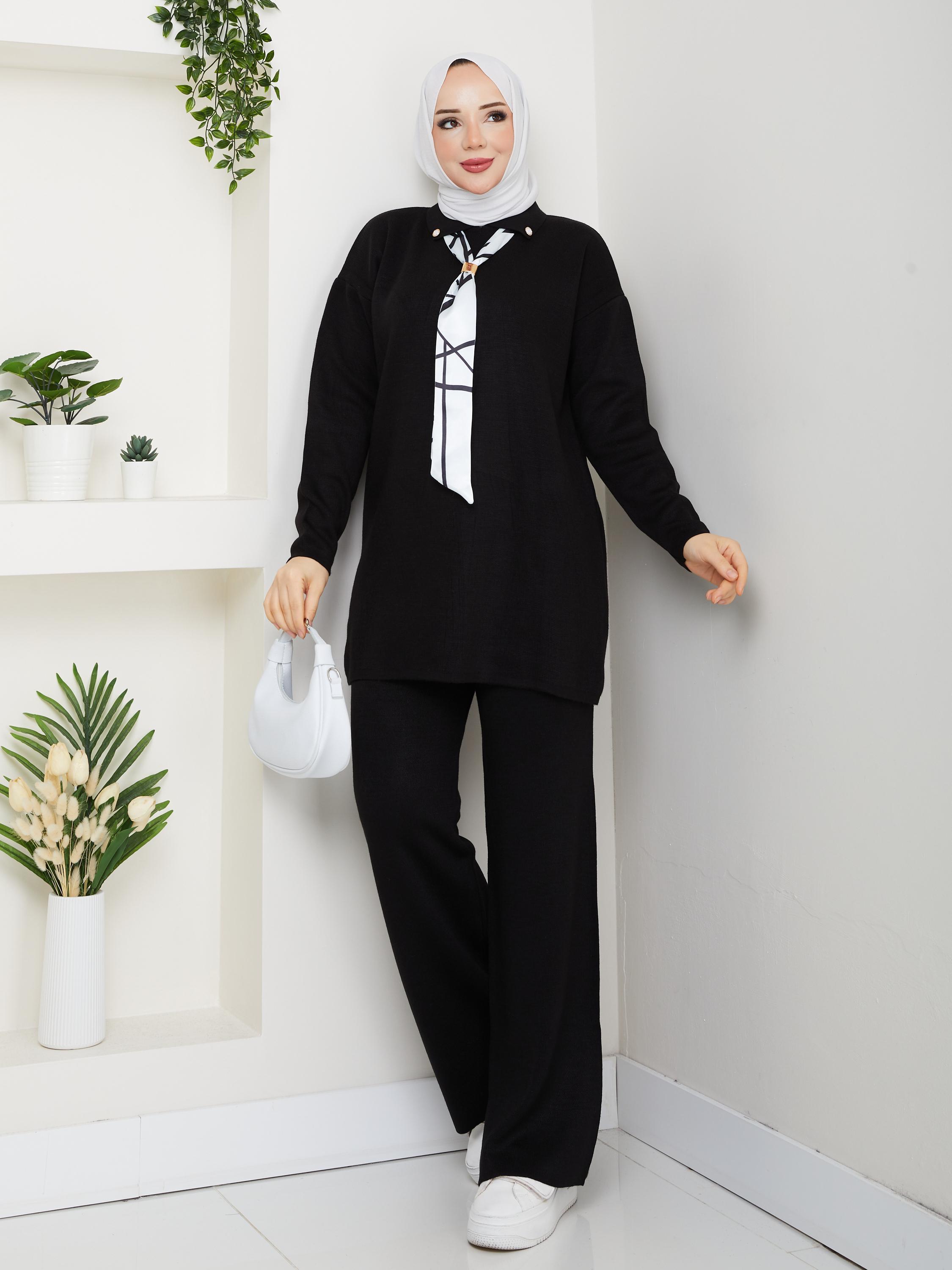 Kadın Siyah Fular Detaylı İkili Tesettür Triko Takım - Tunik Pantolon Kombini