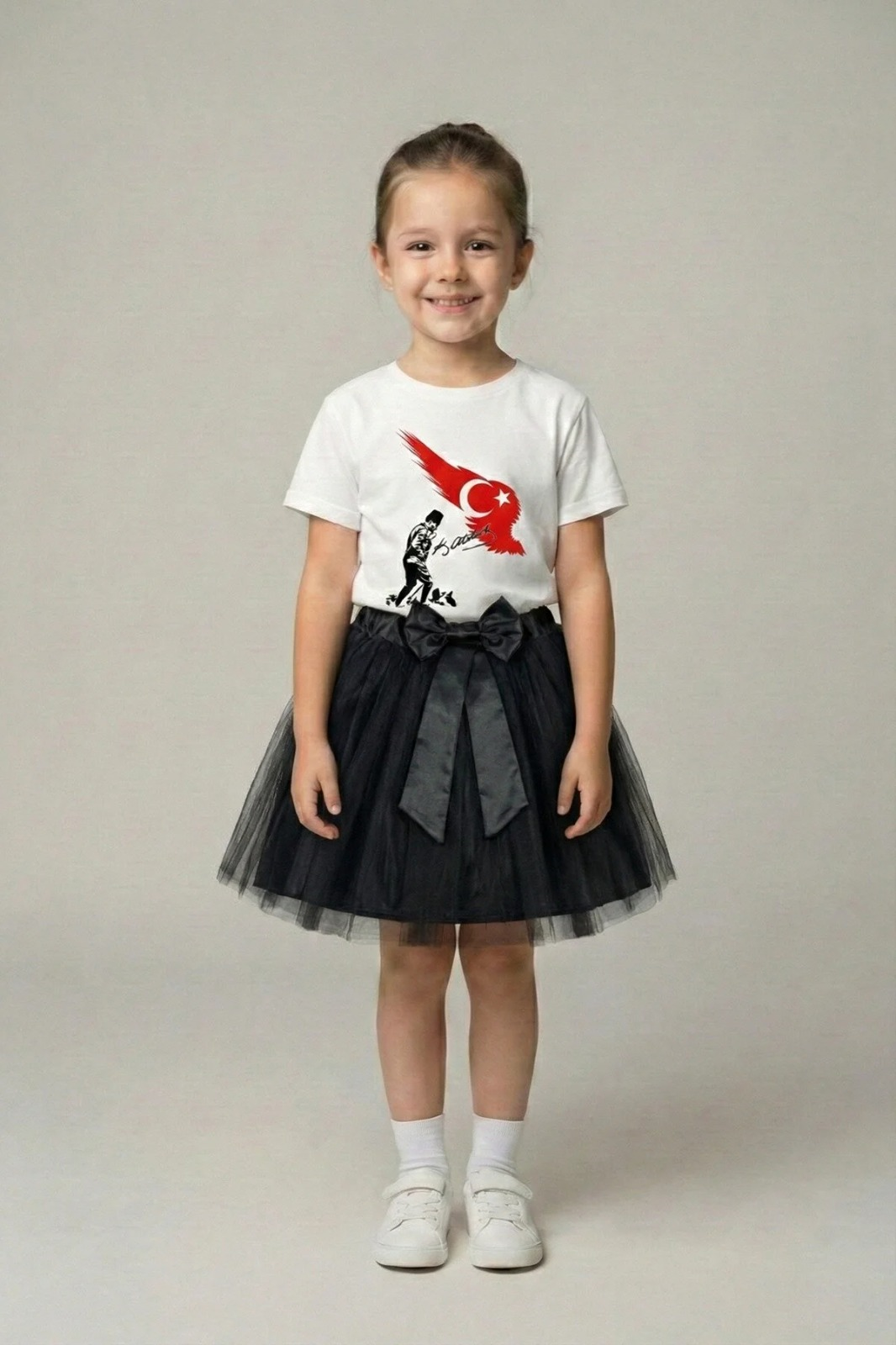 Kız Çocuk Beyaz Kısa Kol Kocatepe Tişört Siyah Tütü Etek Takım 23 Nisan Gösteri Kıyafeti