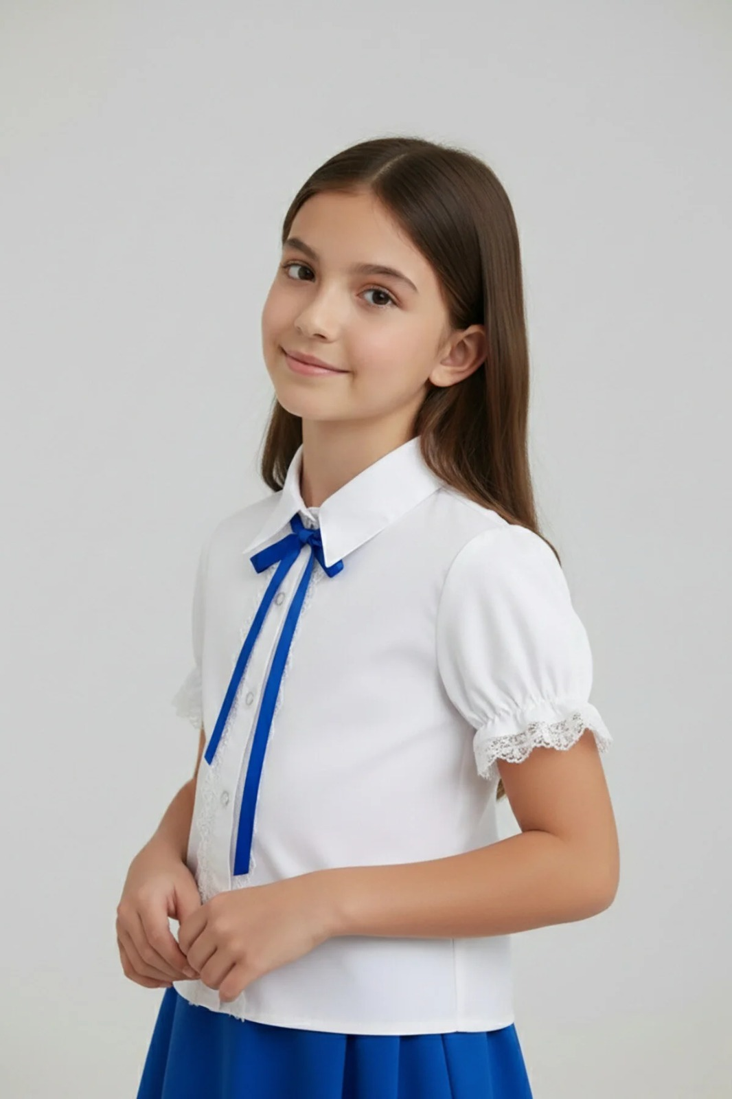 Kız Çocuk Saks Mavi Fiyonklu Dantelli Beyaz Gömlek 23 Nisan 29 Ekim Gösteri Kıyafeti