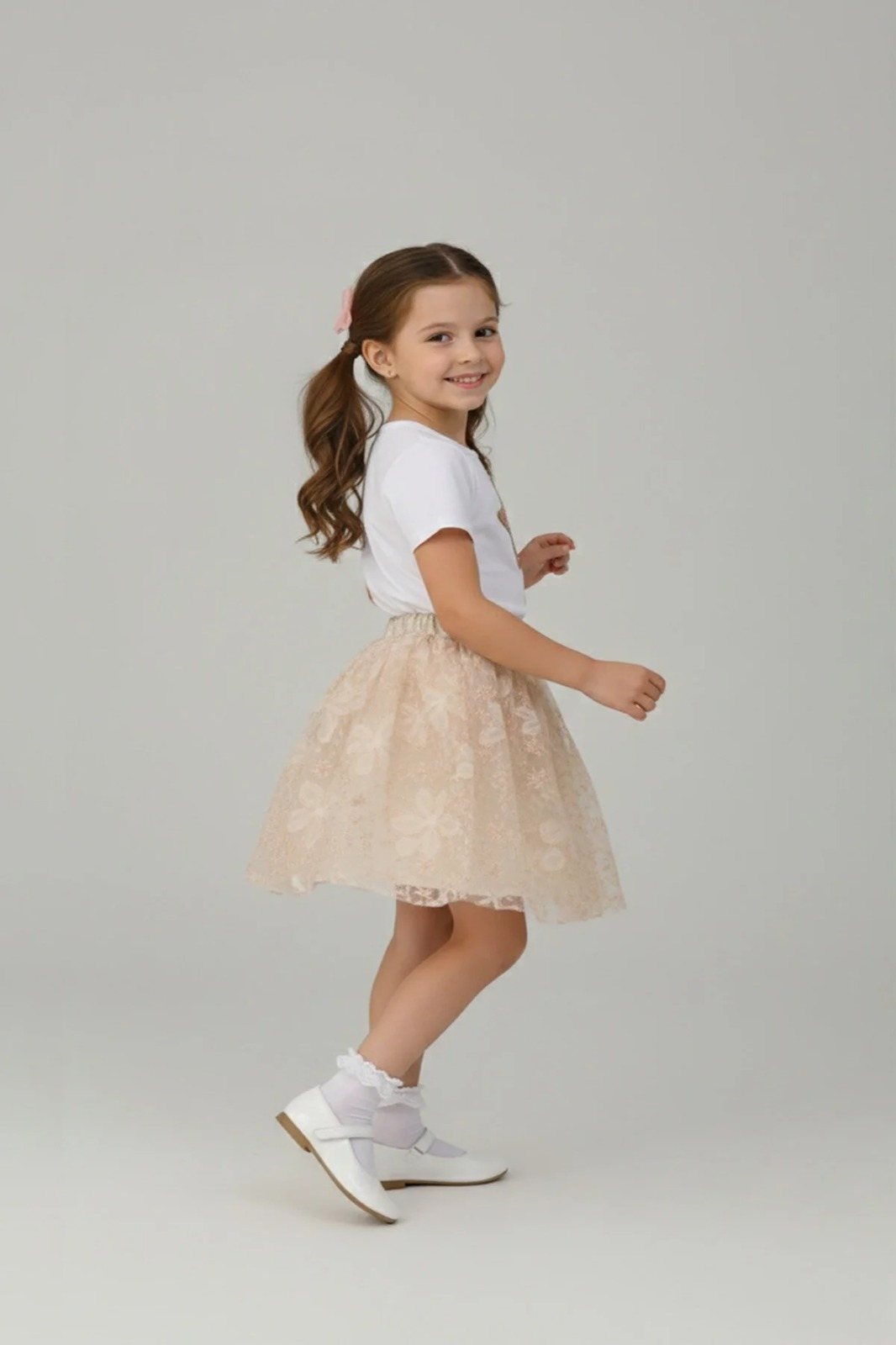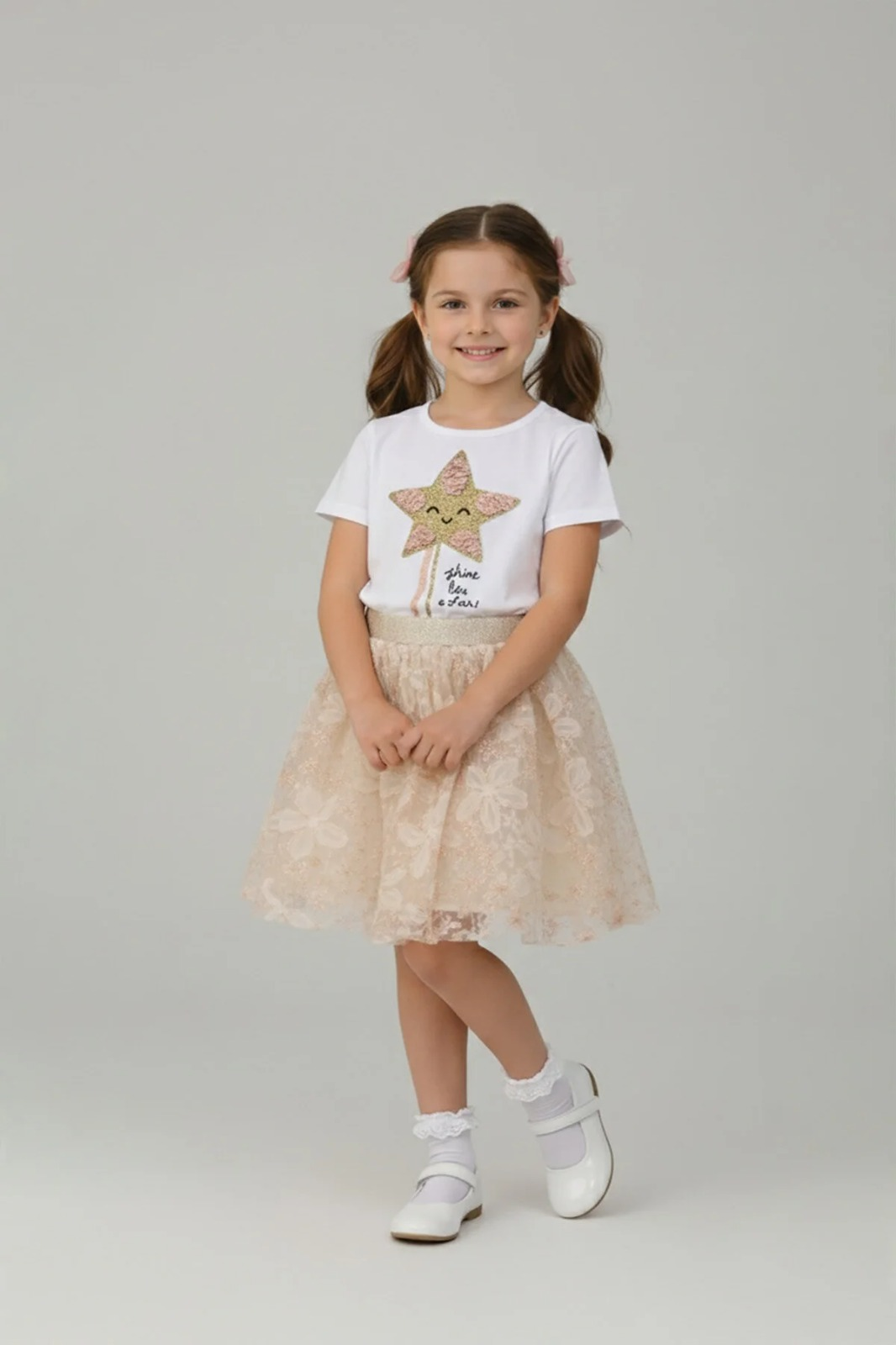 Kız Çocuk Yıldız Figürlü Pullu Tişört ve Çiçek Nakışlı Tütülü Etek Takım 23 Nisan Gösteri Kıyafeti